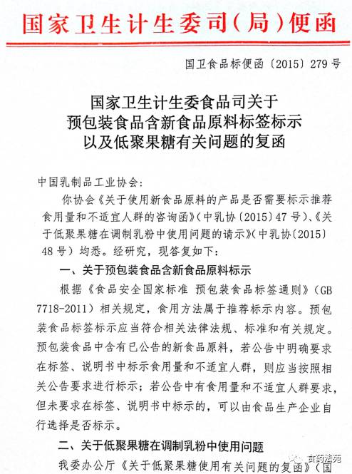 關於預包裝食品含新食品原料標籤標示等有關問題的復函