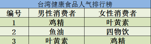 女性人氣健康食品第1位的也是「葉黃素」,第2位的是臺灣特有的健康食品「四物飲」,第3位的是「雞精」。