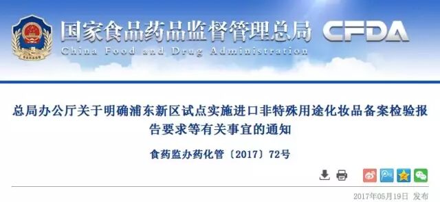 5月19日,CFDA官網發佈《關於明確浦東新區試點實施進口非特殊用途化妝品備案檢驗報告要求等有關事宜的通知》(下稱《通知》)。