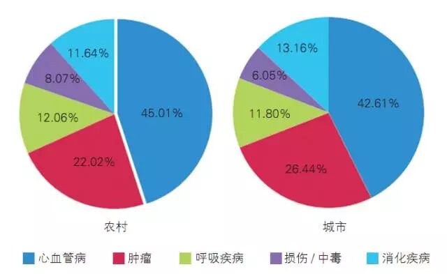 圖 2015年中國農村和城市居民主要疾病死因構成比(%)