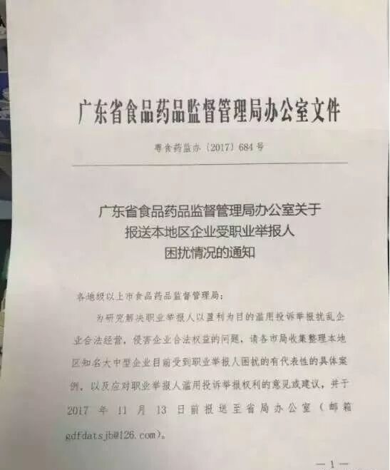 ↑廣東省食藥監管理局要求各地方報送受“職業舉報人”困擾的企業情況