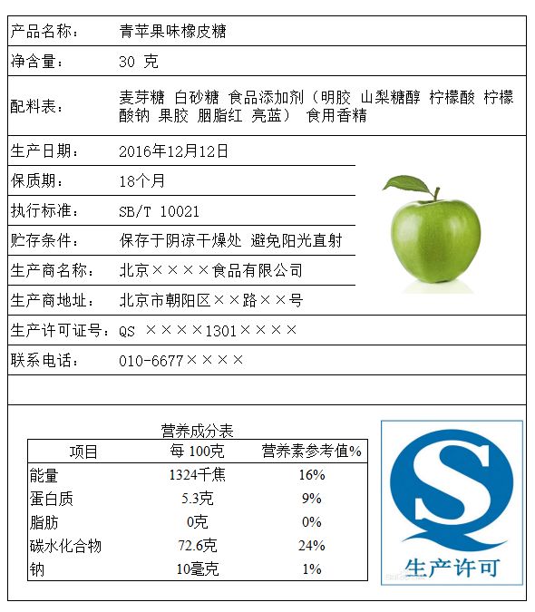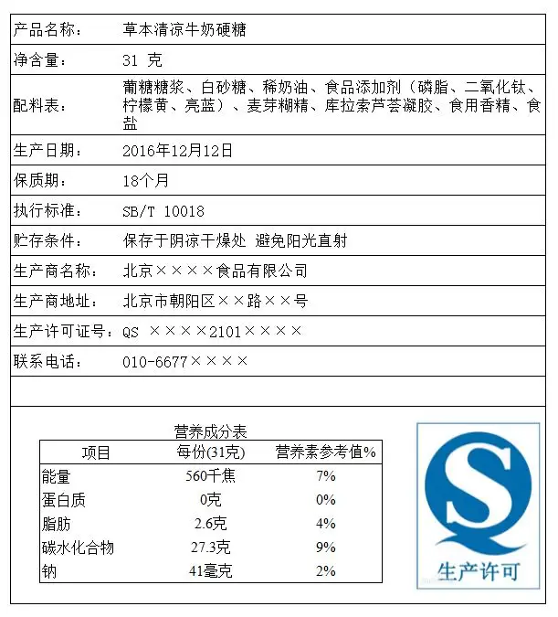 1. 生產許可證號: QS ×××× 2101××××,中2101對應的產品類別為“焙炒咖啡”,本品為糖果製品,對應的類別標號為:1301;