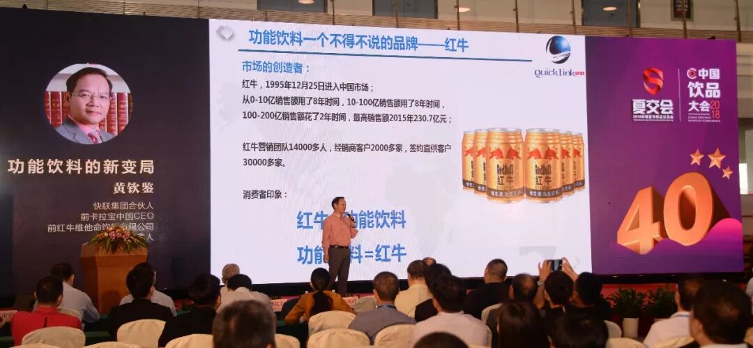 5月11日,華糖雲商夏季精品交易會上,快聯集團合夥人、前卡拉寶中國CEO、前紅牛維他命飲料有限公司華南區負責人黃欽鑒和與會嘉賓一起解構中國功能飲料新變局,分析未來功能飲料市場的發展趨勢。