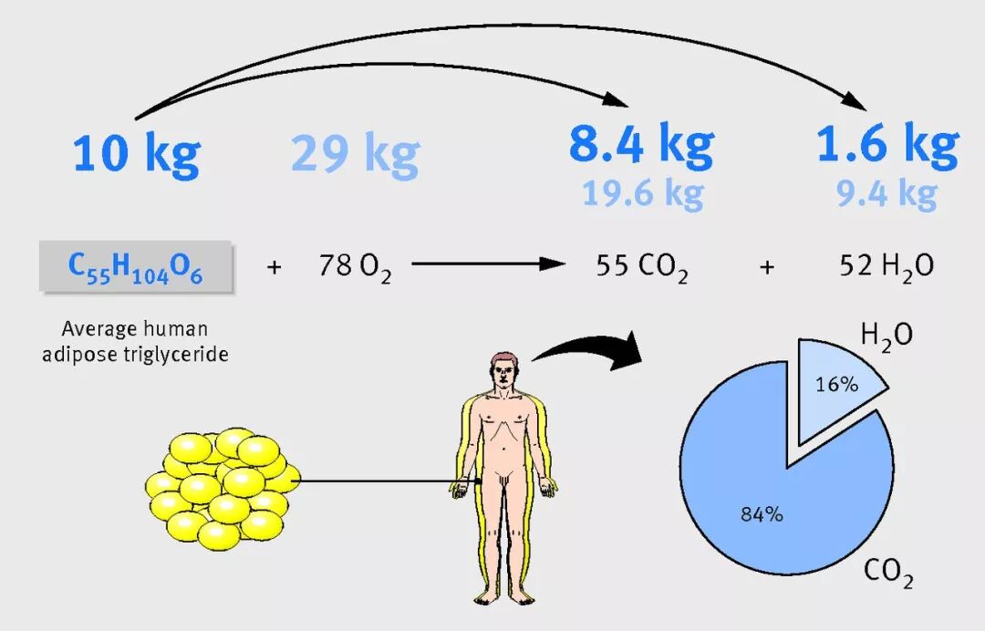 據科學家們計算得出,要燃燒10千克的脂肪,一個人需要吸入29千克的氧氣,燃燒那些脂肪的化學過程會產生28千克的二氧化碳和11千克的水。