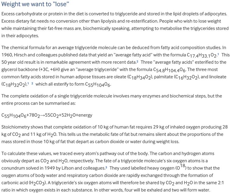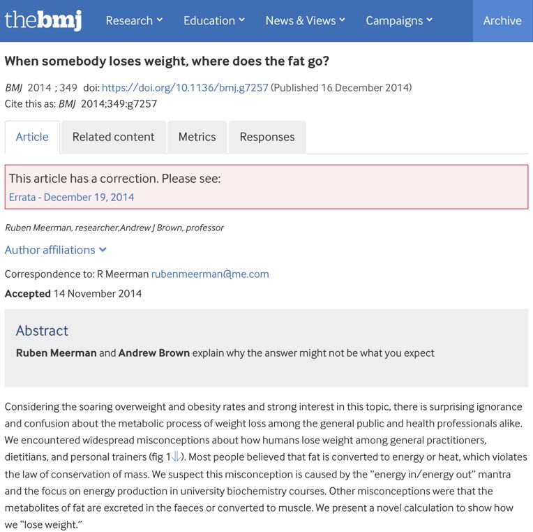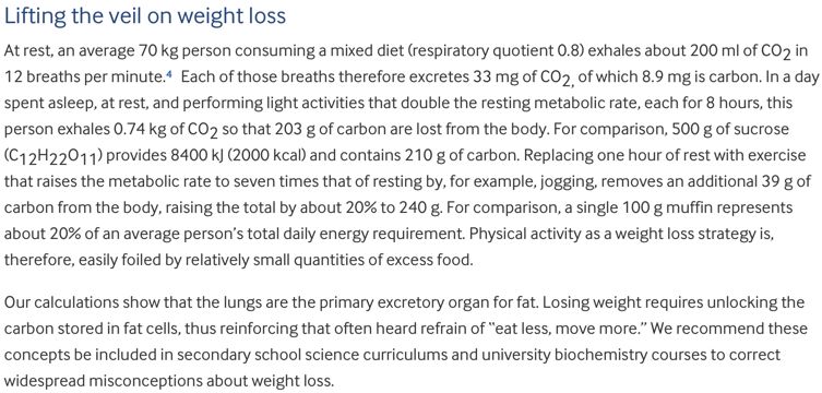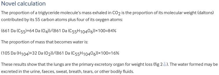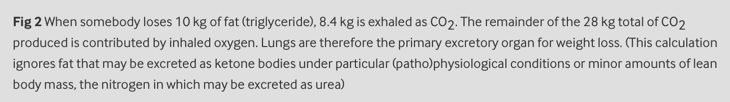 loses weight, where does the fat go?》稱:在體重減輕的過程中,流失的84%的脂肪轉變為二氧化碳後,通過肺部離開人體;剩餘的16%則變成水。